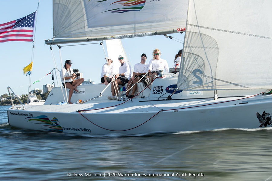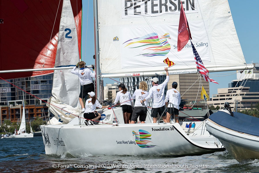 The Warren Jones International Youth Match Racing Championship is an event hosted jointly between the Royal Perth Yacht Club, the Royal Freshwater Bay Yacht Club, and Swan River Sailing, in Perth Waters, Western Australia. Being one of the most prestigious, difficult, and intense youth match racing events in the world, my team and I were super excited to have been invited to race in this event. Among the competitors list of under 25 sailors, were names like Will Boulden, Harry Price, Nick Engot-Johnson, Tom Grimes, and Matt Whitfield, all of whom are ranked inside the top 30 in the Open World Match Race Rankings. One of the most difficult things about this event is the travel to and from the event. We had to travel over 25 hours to get to Perth, but once we had arrived, we understood why it is one of the most legendary sailing venues in all of sailing. Every day was over 80 degrees, sunny, and had great breeze ranging from 8-16 knots. The regatta was sailed in Foundation 36’s which are large 5-7 person keelboats, that are comparable to Long Beach Yacht Club’s Catalina 37’s. The race course was a small bounded area, inside Perth waters, next to Elizabeth Quay, or Downtown Perth. Racing city front was quite the experience. With 8 boats all within 1000 square yards of runway, you could say the racing area was a bit tight, but made for an incredible challenge. Every high level match race regatta has its own characteristics that make it unique. For instance the Governors Cup has rolling swell, Sydney, Australia has Ferry Boat Traffic, and Perth has an extremely small race course. All in all, it made for some great racing. The format was a double round robin, with a semi finals and finals knockout series. This is good news and bad news. Good news is that all the teams get to do a lot of sailing, the bad news is it forces you to operate at a high level all week, and even after that, it comes down to tie breakers in a good fleet like we had. We started off the first round robin strong, taking wins off of the more experienced teams like Egnot-Johnson, Boulden, Grimes, and Whitfield, and ended the series with a record of 7-4 after a point loss to damage. But, with our wins against the other sailors, we were seeded in second, in a four way tie to round out the top half of the fleet. We were pumped coming off the water of Day two. For our rookie, pickup team to come out of the gates swinging like that was a huge feat, and we were proud of how we handled ourselves on the water. Unfortunately, the first half to our second round robin, was not quite as impressive and we failed to beat the big guys again. We fell two positions in the overall standings. With three races left on the Final day of sailing before the knockouts, we had to either win them all, or at a very minimum beat Will Boulden. Unfortunately, we could not do either and missed out of the semi finals, falling victim to several tie breakers. No matter how disappointed we were with this result, we were still proud of how we sailed against these teams, especially in our first year of this event. We learned so much about the boats, the venue, and even our selves. I would first off like to thank my crew for an amazing week; Daniel Pegg on the Bow, Jules Costanzo in the Pit, Max Brennan on trim, Zac Quinlan on the main, and my tactician Annie Scholten, we all came together so well, and left it all out on the water. I would like to also thank The Maritime Sciences and Seamanship Foundation, The Newport Harbor Sailing Foundation, Bahia Sail Racing Association, and the Competitive Edge Fund for their support of our sailing. We truly could not sail these events without their help. And Finally, I would like to thank the host clubs for an amazing event and for giving us the opportunity to come down and race. The team and I know we go down and race the “Wojo” again some day.
