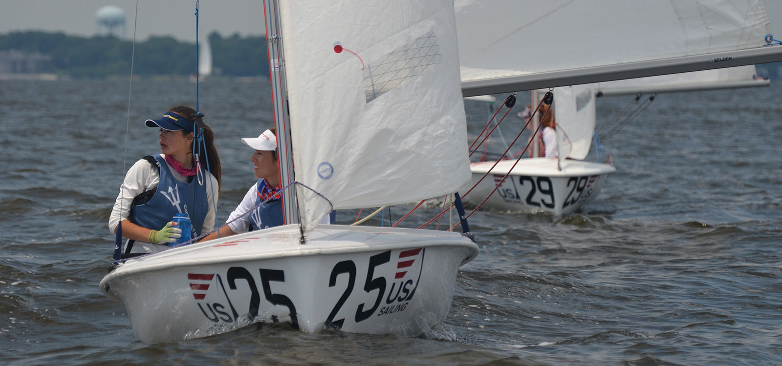Thank you so much for funding my crew, Riley Foster, and I for our trip to Annapolis, Maryland to compete at the US Junior Women’s Doublehanded Championship this July. The regatta consisted of five days of sailing, including two days of clinic and three days of racing. However, Riley and I flew to Maryland a week beforehand to participate in a clinic at Severn Sailing Association, a local sailing organization. As soon as we arrived in Maryland, we were welcomed by almost a thirty degree temperature increase from what we were accustomed to back in California. The clinic did not start until Monday, so we spent our first day touring the US Naval Academy and exploring downtown Annapolis. The next three days, we sailed out of Severn Sailing Association under the direction of some of the country’s greatest coaches: Ian Burman from the United States Naval Academy, John Vandemoer from Stanford University, and Bill Ward from St. Mary’s College of Maryland. During the clinic, we worked on boat speed and boat handling in very challenging conditions. Unlike anywhere I have sailed on the West Coast, the wind in Annapolis was extremely shifty and unpredictable. One minute the wind would be blowing around 18 knots, and before you can switch gears, the wind would die down to 2-3 knots. Although it was very frustrating at times, I quickly learned how to tune my boat for shifty conditions and was able to apply the knowledge I learned from the clinic to the following regatta. Because the weather is so unpredictable, we had to retire from sailing one morning due to lack of wind. However, the coaches used this opportunity to help us look at sailing from a different perspective. Split into groups, we analyzed video and boat rigging and discussed the benefits of the many different approaches to boat handling and boat set up.