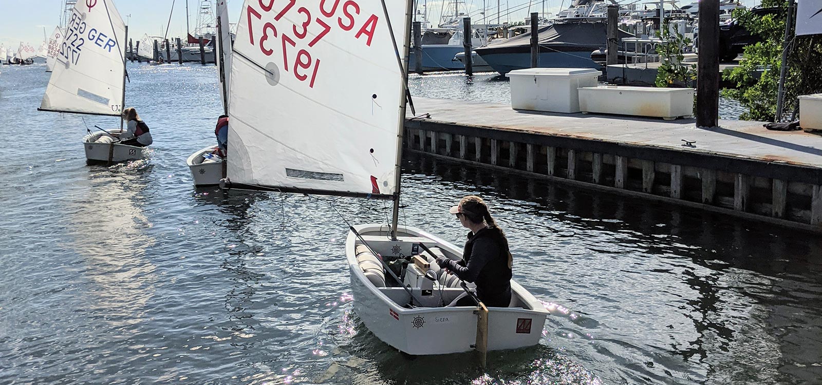 Coral Reef Yacht Club hosted a four-day clinic the week before the regatta that my sister and I attended. I really was able to learn how the controls affected the boat, how sail ties affect the sail shape and my boat speed, and how to use the sprit pole, something that a sabot does not have. Learning an aggressive roll tack with the centerboard helped my overall boat handling substantially and it helped me work my way through the chop and the wind.